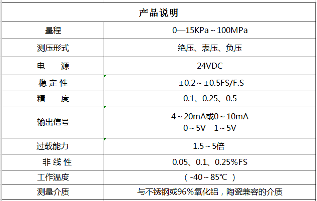 PT355型無腔變送器采用進(jìn)口高精度高穩(wěn)定性芯片和優(yōu)良的組裝技術(shù),經(jīng)精密的溫度補(bǔ)償,將芯體置于全不銹鋼殼體內(nèi),結(jié)構(gòu)精巧;廣泛應(yīng)用于航空航天、石油、化工、治金、電力、煤氣、氣象等領(lǐng)域;既可以進(jìn)行表壓或絕壓的測量,又可以測負(fù)壓、真空度等。